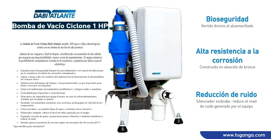 La Bomba de Vacío Ciclone Dabi Atlante, modelo 1HP (para 4 sillas odontológicas) cuenta con un sistema de succión de alta potencia. Además de ser compacta y fácil de limpiar, está fabricada con materiales de alta calidad que aseguran una larga durabilidad y menos costes de mantenimiento. El equipo minimiza la posibilidad de contaminación cruzada en el consultorio y garantiza más ahorros para el odontólogo.